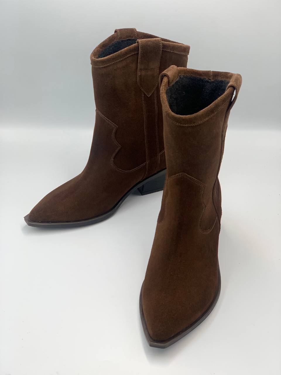 Жіночі черевики у стилі «козаки», виконані з натуральної замші у коричневому кольорі. Вони поєднують трендовий дизайн, зручну конструкцію та натуральні матеріали, що робить їх ідеальним вибором для весняно-осіннього періоду.